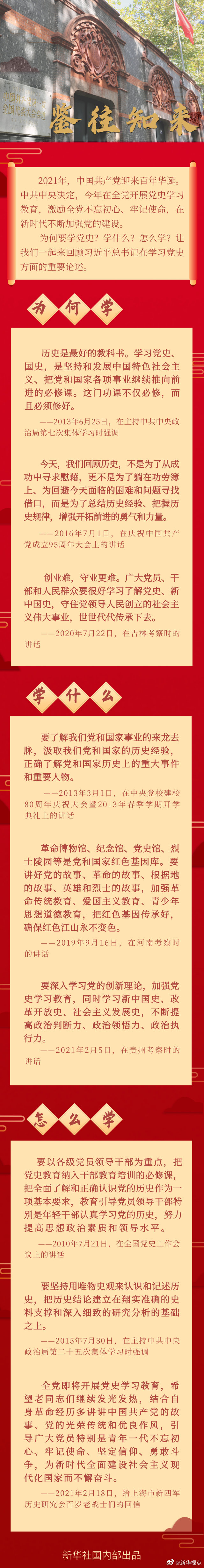 2021年,中国共产党迎来百年华诞。中共中央决定,今年在全党开展党史学习教育,激励全党不忘初心、牢记使命,在新时代不断加强党的建设。为何要学党史?学什么?怎么学?让我们一起来回顾习近平总书记在学习党史方面的重要论述。