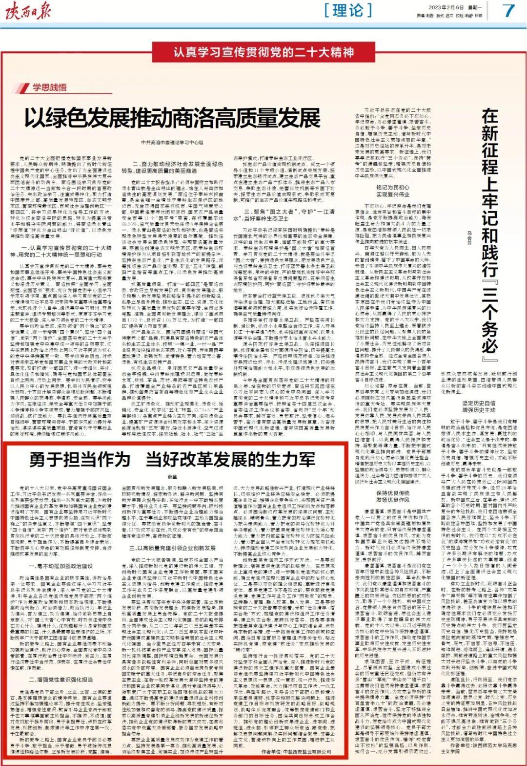 新的赶考之路上,国有企业党员干部务必要勇于斗争、敢于担当、乐于奉献,勇于破除传统思维惯性和路径依赖,立足新发展阶段,完整、准确、全面贯彻新发展理念,服务和融入新发展格局,积极研究新情况、探索新办法、解决新问题。坚持用新发展理念指导实践,在知行合一中不断增长智慧才干、提升业务水平。要坚持问题导向,把科技创新作为重要任务,不断提升企业治理能力和治理水平,在干事创业和攻坚克难中,主动为国担当和分忧。要鼓励党员争做新时代的担当者、奋斗者,以“功成不必在我,功成必定有我”的使命担当锤炼党性修养,奋进新的征程。