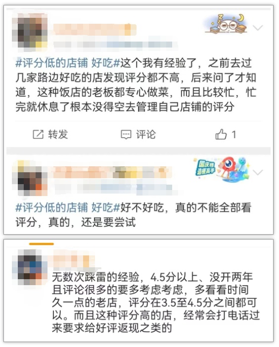 网友打卡低分餐厅,不是一味只求分低,而是总结了一套逻辑自洽的规律——餐厅评分在3.5分到4分之间;先看差评内容,再决定要不要尝试。因为按照常理来说,大部分顾客即使对菜品满意,也很少主动花时间写好评;很多老店口味上佳,但碍于人手不够,没空更没心思去管理评分,分数自然偏低。再加上众口难调,不同人对口味偏好、就餐环境、服务态度的意见不统一,十分常见。别人吃不惯的,没准儿合自己口味;别人介意的,自己未必在乎,不是一个数字就能简单囊括的。