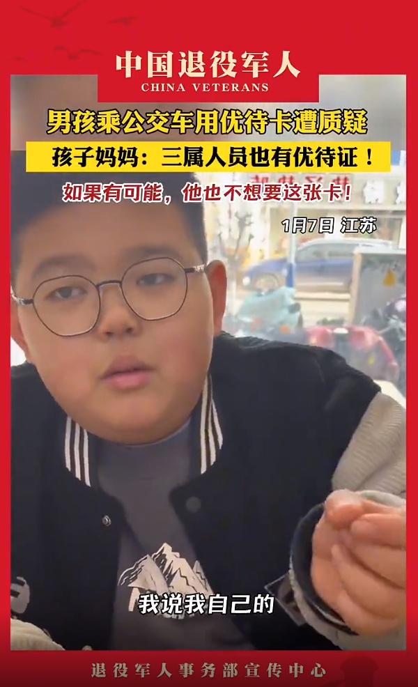 “嘀,优待卡——”近日,江苏徐州一男孩独自刷优待证乘车,被司机质疑:“优待卡?你拿谁的卡?”男孩举起卡说:“我自己的……”据报道,该名男孩的父亲2015年在部队因公牺牲,那时他才4岁。今年已12岁的他,周末的时候总会去乡下看望爷爷奶奶,那天因为妈妈工作太忙才独自拿着优待证乘车,没想到与司机有了刚刚那段对话。视频中,男孩经妈妈安慰,释怀道:“咱自己知道就好”。