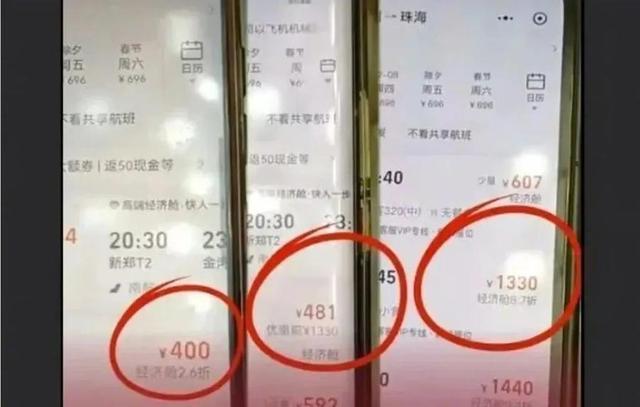 2月7日郑州飞往珠海的航班,不同手机、不同账号搜索该航班显示出不同价格。图源网络